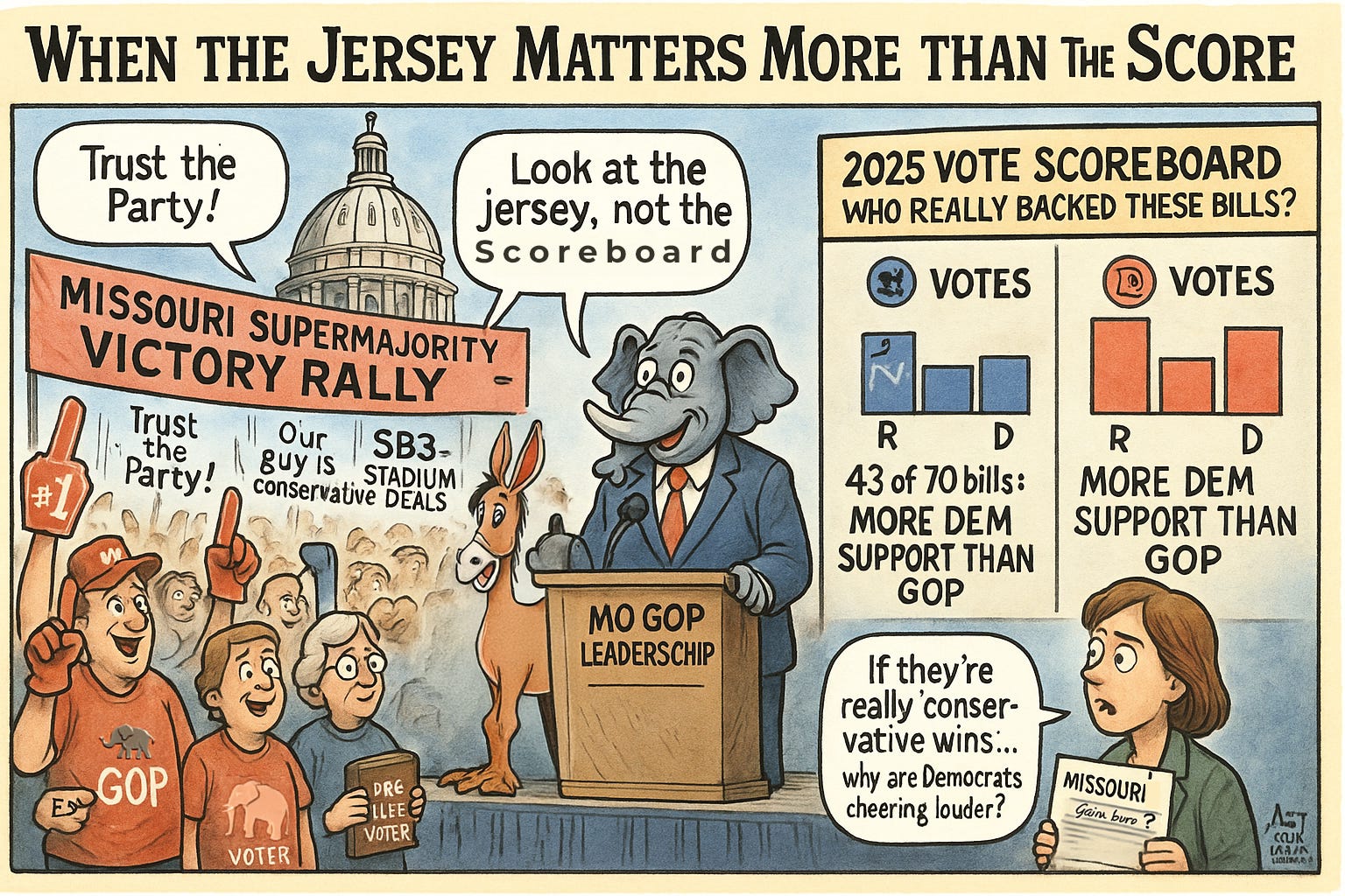 These patterns hit home hardest in Missouri’s red heartland, where local GOP loyalty feels like patriotism. But as the 2025 Grades reveal the establishment’s true colors. Three of the “worst” bills—SB4 (the Utility Bill), SB82 (the Water Permitting bill), and SB3 (the Stadium Bill, funneling taxpayer dollars to Kansas City Royals teams)—passed with overwhelming Democratic backing, exposing a Uniparty agenda that ignores conservative voters.